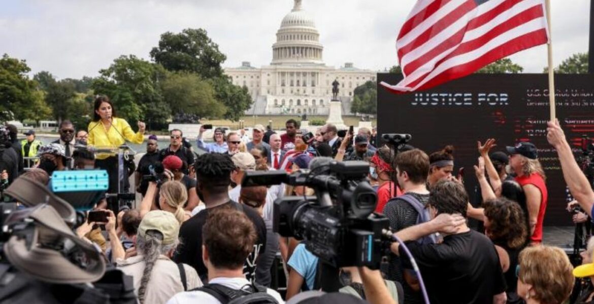 The rally wound down with videos shown on the big screen which showed numerous events where individuals overwhelmed the Capitol, occupied congressional offices, and violently attacked police in the Capitol, including Sandy Ocasio Cortez, illustrating the key reason for the rally – the two-tiered justice system where decades of often violent events in the Capitol routinely end with a simple fine, whereas of the 595 arrested, many have been jailed in solitary confinement with reports of beatings and extreme treatment in the Washington DC jail in particular, with a recent report of one individual nearly beaten to death, losing the use of one eye after having been cursed and beaten.