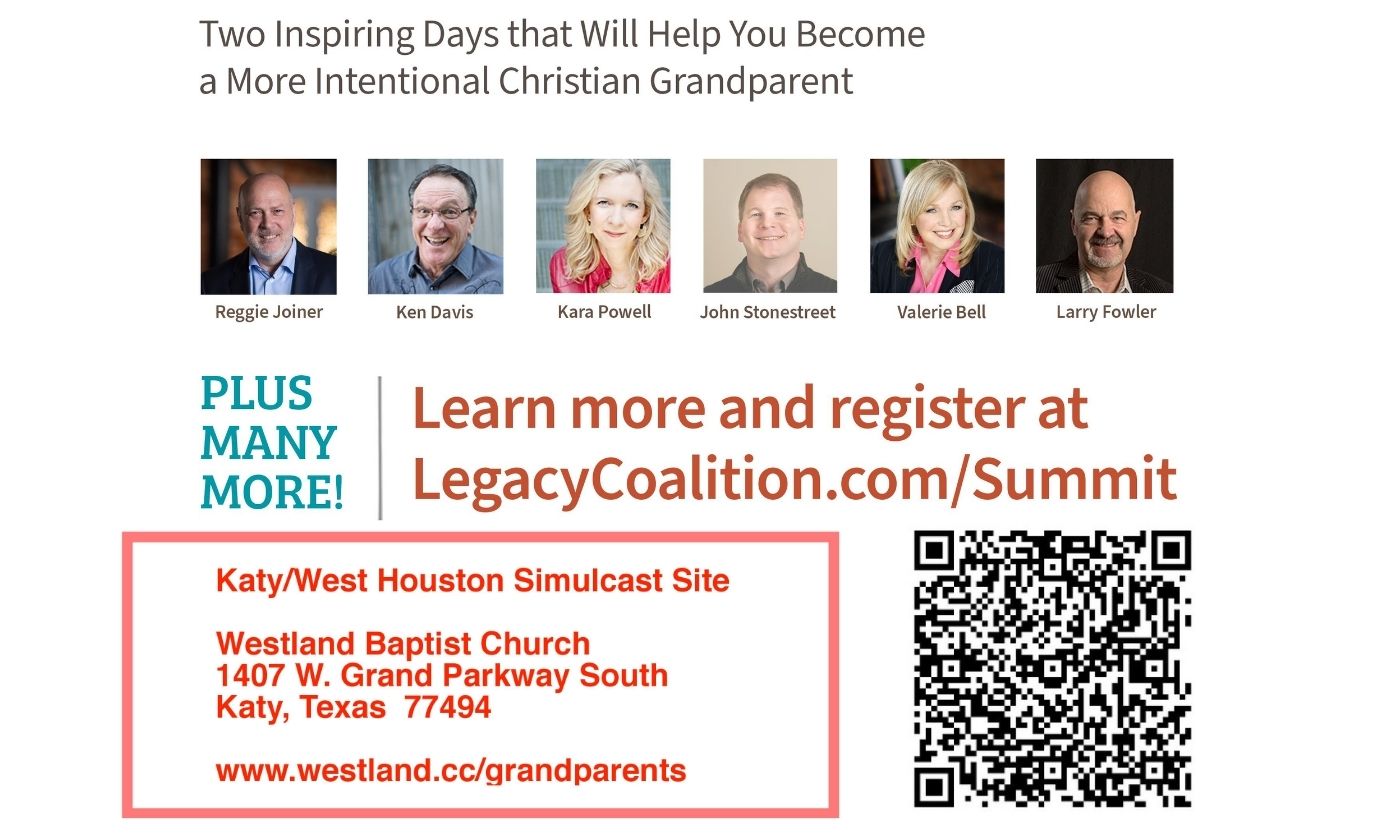 The cost for the conference is $59 and registration is online at https://legacycoalition.brushfire.com/Legacy-Grandparent-Summit-Simulcast/457833. If you would like to register directly at Westland Baptist Church, go to www.westland.cc/grandparents.