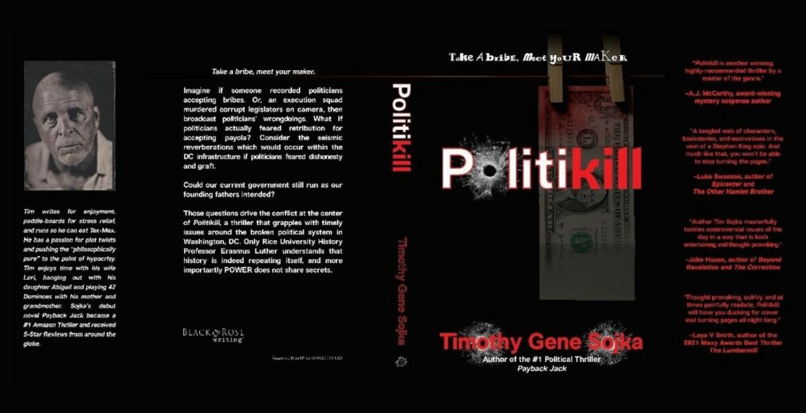 Politikill is local novelist Timothy Sojka’s sophomore offering. Sojka’s been labeled a tight wordsmith, but his work invites different labeling; fast paced, thought provoking, twisty, and most often controversial. Sojka takes on big topics like the death penalty, PACs, and career politicians. His work encourages readers to pick a side, then forces them to get uncomfortable with their decision.