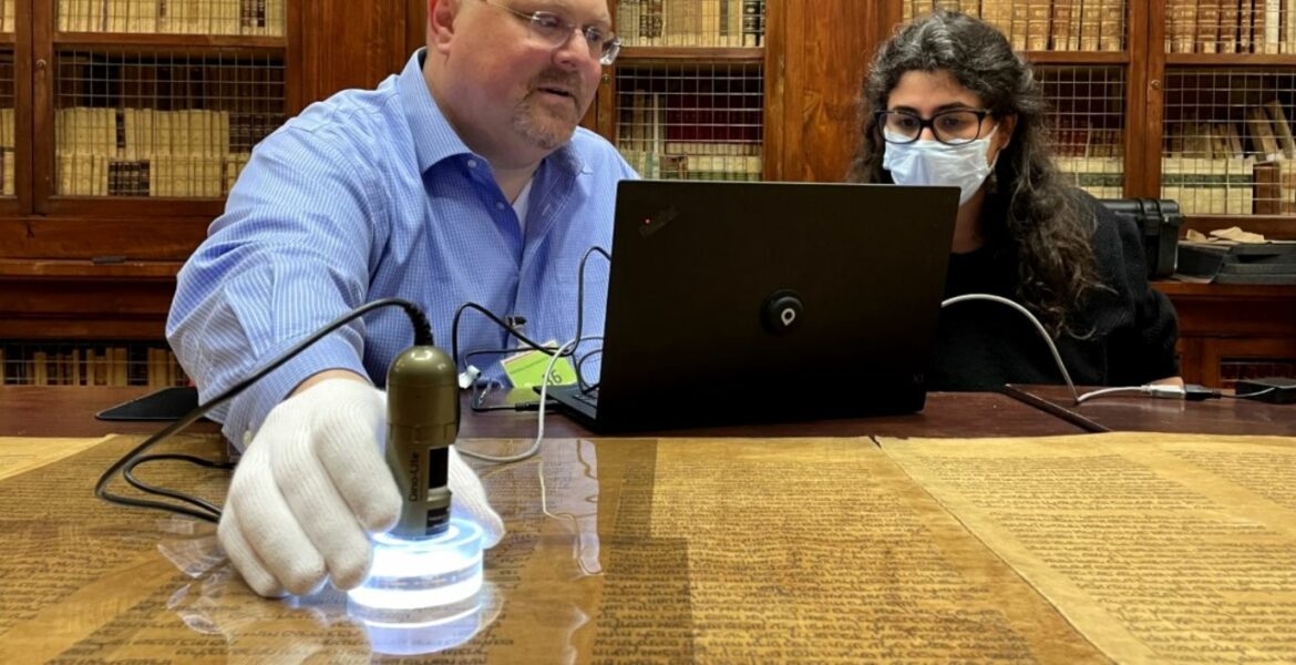 Dr. Gordon used special techniques to recover lost text – not visible to the naked eye – including a 50x microscope to examine codex details under visible, near-infrared, and ultraviolet light.