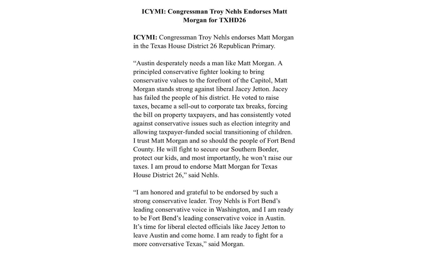 Matt Morgan’s bid to unseat incumbent Jacey Jetton in Texas House District 26 in Fort Bend County, Texas, received a major boost today when former Fort Bend County Sheriff and current and extremely popular Congressman Troy Nehls-R endorsed his campaign.