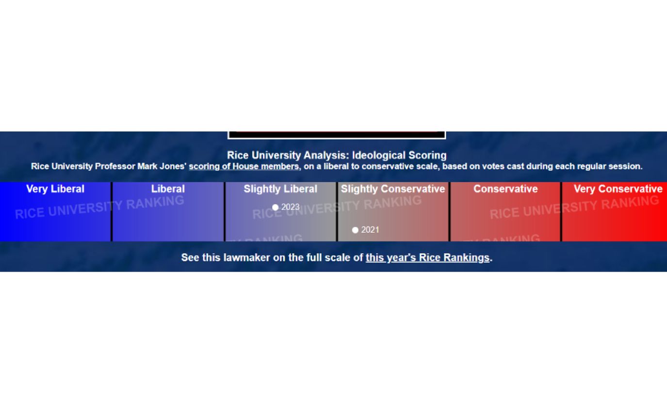What is measurable is where on the ideological scale Jetton’s values reside, as captured by a Rice University Analysis tool for the ideological scoring of legislators. The tool describes Jetton, in 2023, as “slightly liberal.”