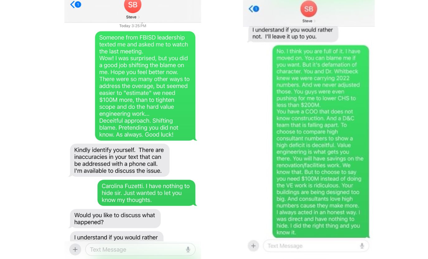 “Someone from FBISD leadership texted and asked me to watch the last meeting. Wow! I was surprised, but you did a good job shifting the blame on me. Hope you feel better now. There were so many other ways to address the overage, but it seemed easier to ‘estimate’ we needed $100 million more, than to tighten scope and do the hard value engineering work,” Fuzetti said.