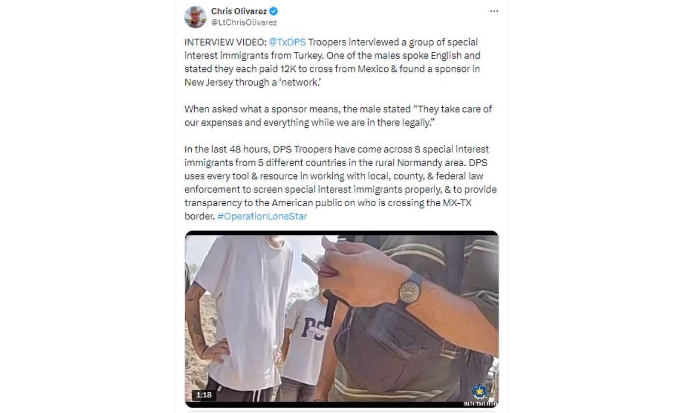 In a separate post, Olivarez wrote, “@TxDPS Troopers interviewed a group of special interest immigrants from Turkey. One of the males spoke English and stated they each paid 12K to cross from Mexico & found a sponsor in New Jersey through a ‘network.’”