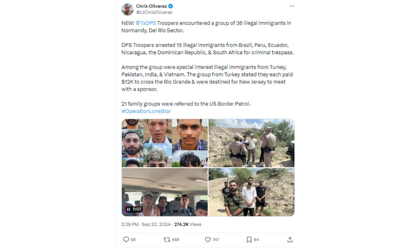 On Sept. 20, Texas Department of Public Safety spokesman Lt. Chris Olivarez posted to X a recent encounter with a group of illegal immigrants, including Special Interest Aliens.