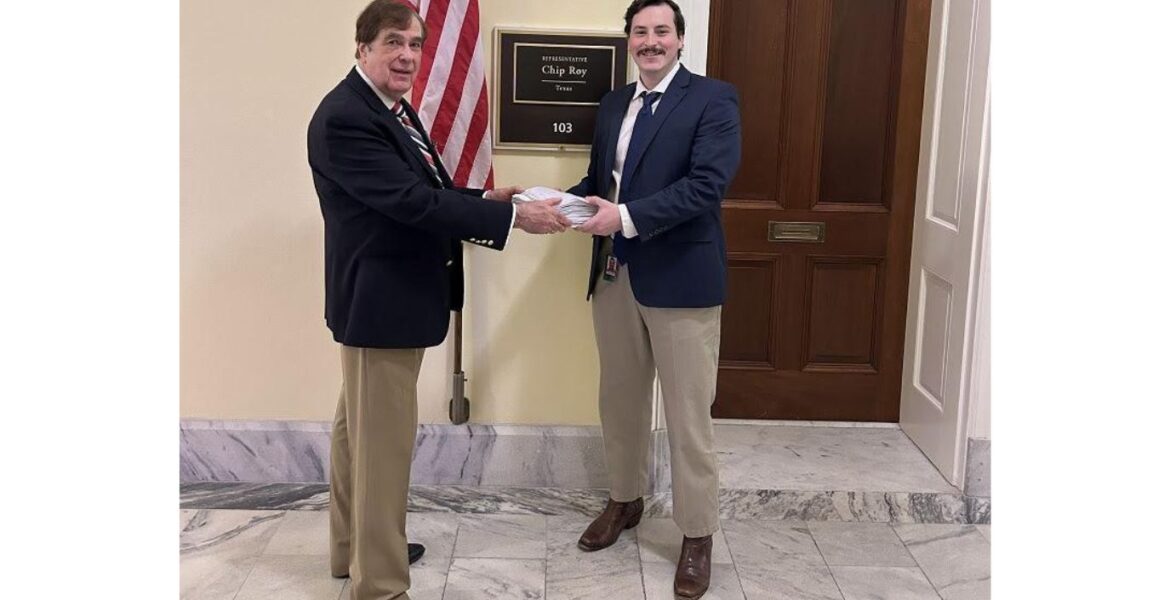 Photo: Tom DeWeese presenting petitions to Congressman Chip Roy’s staff.