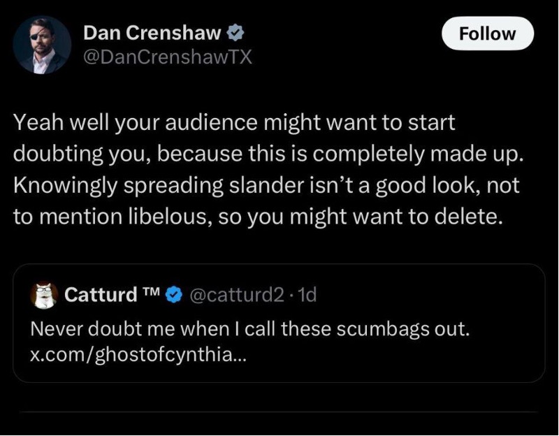 “Your audience might want to start doubting you, because this is completely made up,” Crenshaw responded on X. “Knowingly spreading slander isn’t a good look, not to mention libelous, so you might want to delete.”