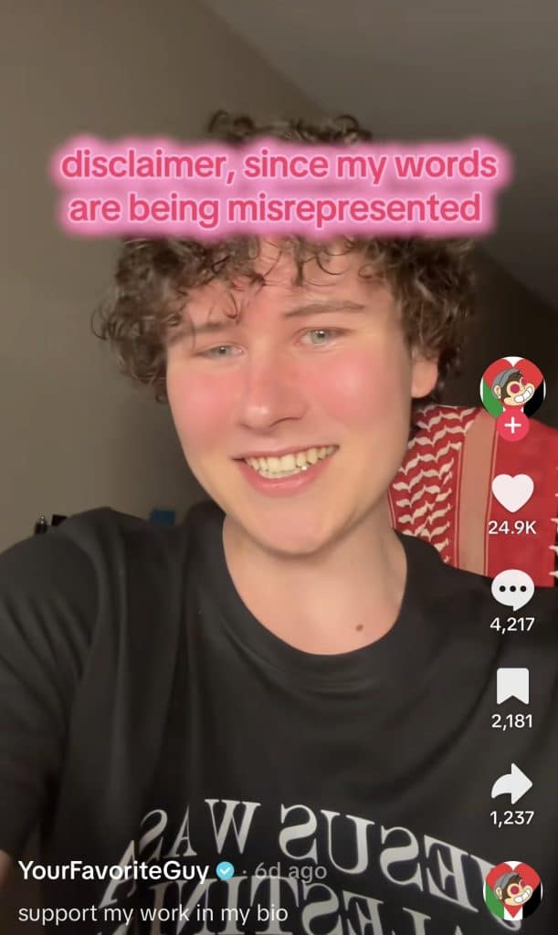 Christensen’s rhetoric echoes language long used by extremist movements, yet he delivers it through the polished aesthetic of Gen Z content creation. In the video praising the murders, he wore a keffiyeh, a shirt that appeared to read “Jesus was a Palestinian,” and sat in front of a Palestinian flag.